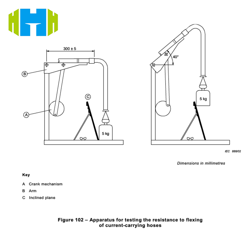 Feature: The end of the hose intended to be connected to the motorized cleaning head is attached to the pivoting arm of the test equipment shown in Figure 102. The distance between the pivot axis of the arm and the point where the hose enters the rigid part is 300mm±5mm. The arm can be raised from the horizontal position by an angle of 40°±1°. A mass of 5 kg is suspended from the other end of the hose or from a convenient point along the hose so that when the arm is in the horizontal position the mass is supported and there is no tension on the hose.