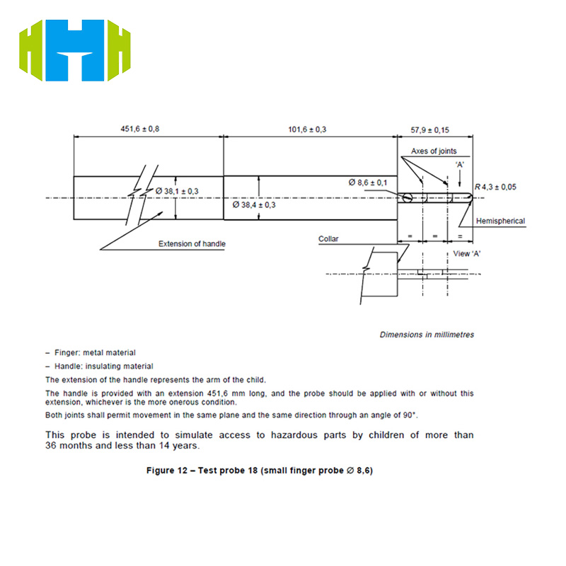 The HT-I12 Large Child Test Finger is a professional safety testing tool used to evaluate whether the live parts or mechanical parts of the outer shell of electrical appliances, machinery and other products can be touched by children aged 36 months to 14 years old, ensuring the safety of the product in actual use and preventing children from accidentally touching dangerous parts.